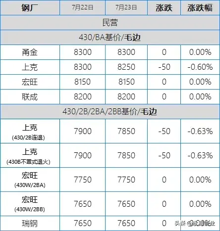 目前市場主流報價:410S熱軋黑皮在6100-6150元/噸;430熱軋黑皮在6700-6800元/噸;太鋼/酒鋼430/2B(毛)在7850-7950元/噸;聯眾430/2BA(毛)在7700-7800元/噸;宏旺430/2BA(毛)在7700-7800元/噸;甬金430/BA(毛)在8300元/噸左右;上克430/BA(毛)在8250元/噸左右;宏旺430/BA(毛)在8100-8200元/噸;瑞鋼430/2BA(毛)在7650-7700元/噸,其中期貨價在7800元/噸左右;聯成430/BA(毛)在8200元/噸左右。
