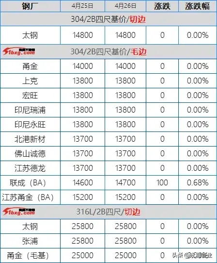 今日,青山代理持平報4-5月期貨,鼎信304冷軋窄帶13600元/噸,30478冷軋窄帶13100元/噸,304熱軋大板13630元/噸,30478熱軋大板13100元/噸。