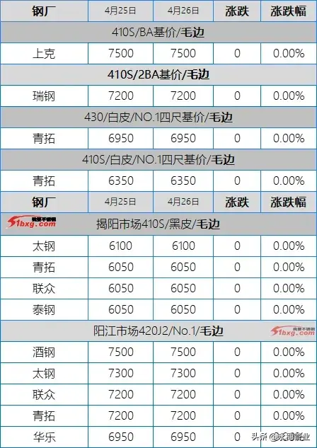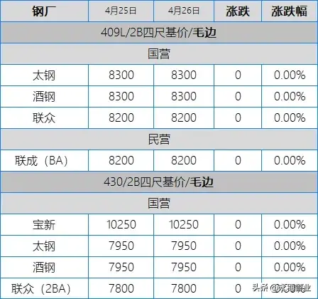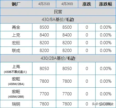 目前市場主流報價:410S熱軋黑皮在6050-6150元/噸;430熱軋黑皮在6650-6750元/噸,其中個別高位在6800元/噸左右;太鋼/酒鋼430/2B(毛)在7950-8000元/噸;聯眾430/2BA(毛)在7750-7800元/噸;宏旺430/2BA(毛)在7750-7800元/噸;甬金430/BA(毛)在8500元/噸左右;上克430/BA(毛)在8400元/噸左右;宏旺430/BA(毛)在8150-8200元/噸;瑞鋼430/2BA(毛)在7700-7800元/噸;聯成430/BA(毛)在8200元/噸左右。