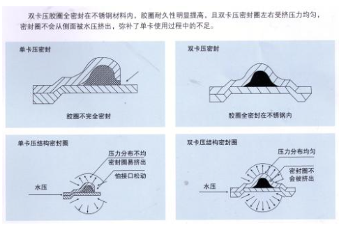 雙卡壓式膠圈密封在不銹鋼材料內,膠圈耐久性明顯提高,且雙卡壓密封圈左右受擠壓均勻,密封圈不會從側面倍水壓擠出,彌補了單卡壓適用過程中的不足。
