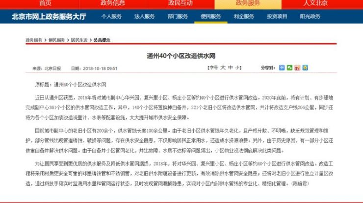2020年底前,將有計劃、有步驟地完成副中心361個小區的供水管網改造工作,其中,140個小區將置換掉自備井,221個老舊小區將改造供水管網,共計將改造支戶線206公里,同步還將為各個小區加裝改造流量計、水表等配套設施,大大提升城市供水安全保障。