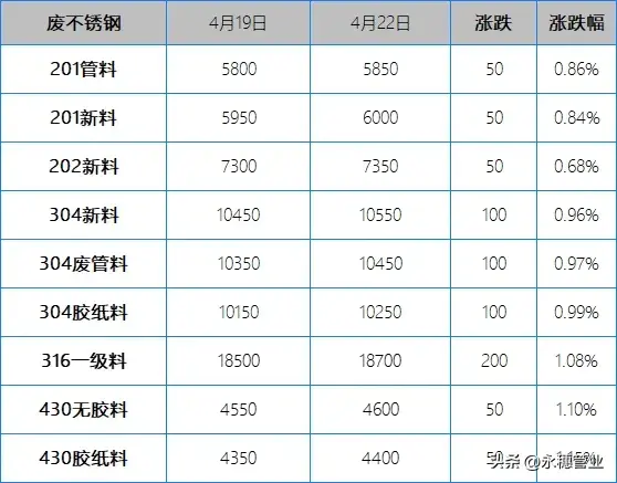 較上周五早間,今日早間市場201報價上漲50-100元/噸;304報價上漲100-200元/噸;目前主流報價區間:201新料在5900-6000元/噸,個別在6050元/噸左右;304新料在10500-10600元/噸,其中集中在10500-10550元/噸。