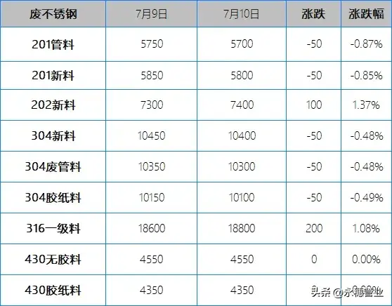 較昨日早間,今日早間市場201報價部分持平,部分下跌30-50元/噸;304報價部分持平,部分下跌50-100元/噸,目前主流報價區間:201新料5700-5800元/噸;304新料在10300-10400元/噸。