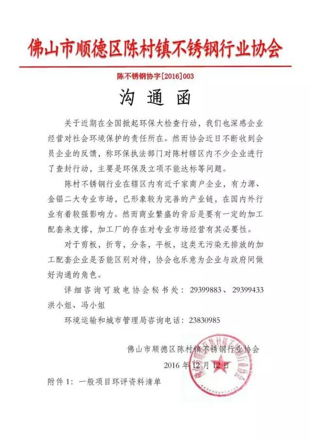 而就在本周初(12月12日),陳村鎮不銹鋼行業協會發溝通函,就金錩、力源兩大市場剪板、折彎、分條、平板等無污染無排放的加工配套企業與政府溝通,望能區別對待。