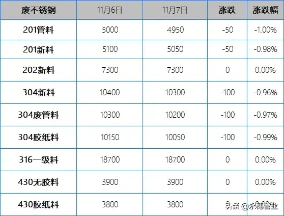 廢料方面:今日早間304下調20-100元/噸,午后反彈上漲30-80元/噸,市場具體成交以看貨定價為主;201早間部分下調30-50元/噸,午后多有跟高收貨現象。目前市場主流報價區間:201新料在5000-5100元/噸;304新料在10250-10350元/噸。