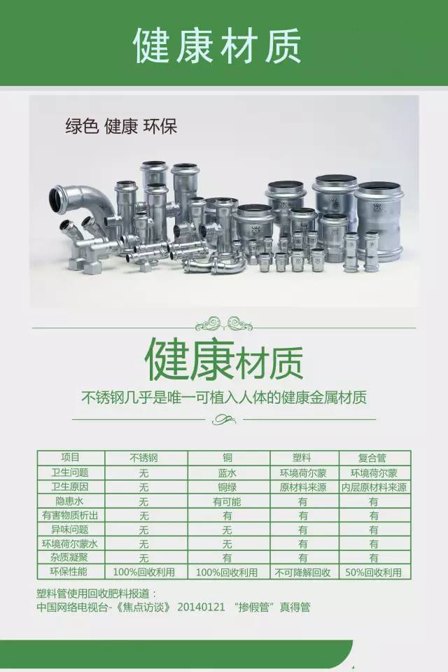 在這樣的大背景下,不銹鋼管材以其幾乎為零的漏水率和無與倫比的健康性被推上了城市供水系統和建筑物水管領域。研究并實際表明,一旦不銹鋼管材被廣泛運用,城市管網的漏水率將大幅度降低,建筑物水質將得到充分保障。薄壁不銹鋼管材以其所特有的安全性、可靠性、清潔性、耐用性、經濟性和環保性等各方面突出優勢,為保護水資源、改善水質、保護人們的健康和提高生活質量,保護人們的健康的提高生活質量,保護環境和促進社會經濟的可持續發展發揮關鍵作用。