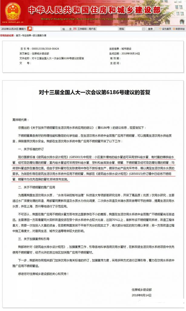 國家住房城鄉建設部在《對十三屆全國人大一次會議第6186號建議的答復》中公開表態:為鼓勵引導在建筑生活飲用水系統中應用不銹鋼供水管,已在《建筑給水排水設計規范》(GB50015)修訂稿中將不銹鋼管、銅管作為優先選擇的供水管材,即將發布實施。